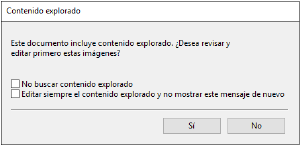 Si los documentos PDF insertados albergan contenido escaneado, y si la preferencia para comprobar el contenido escaneado está habilitada, se mostrará un mensaje preguntándole si desea revisar y editar las imágenes exploradas. Solamente se pueden editar las páginas que contienen imágenes escaneadas. Sin embargo, las preferencias para comprobar si hay contenido escaneado y mostrar el mensaje de contenido escaneado se pueden desactivar.