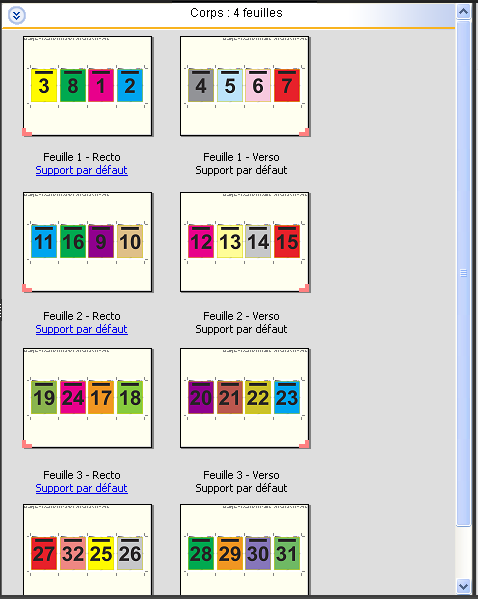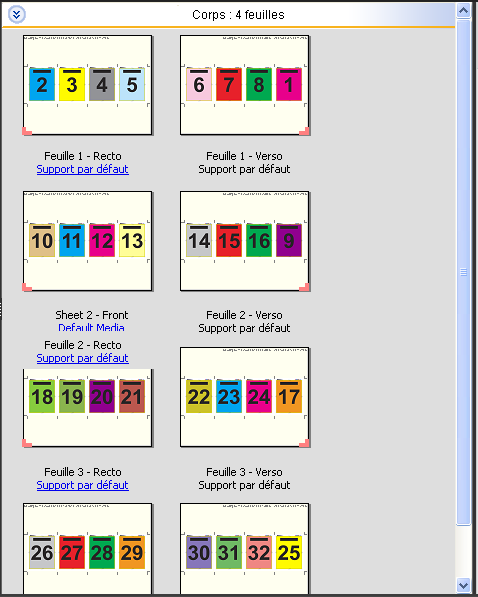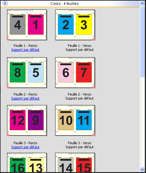 La mise en page Dos carré collé 2 poses est destinée aux tâches composées de multiples de quatre pages, mais elle peut également être utilisée avec d’autres tâches ayant un nombre de pages quelconque. Fiery Impose ajoute des pages vierges selon les besoins. Les pages sont agencées par groupes de quatre pour que, une fois pliée, chaque feuille soit composée de quatre pages consécutives.
