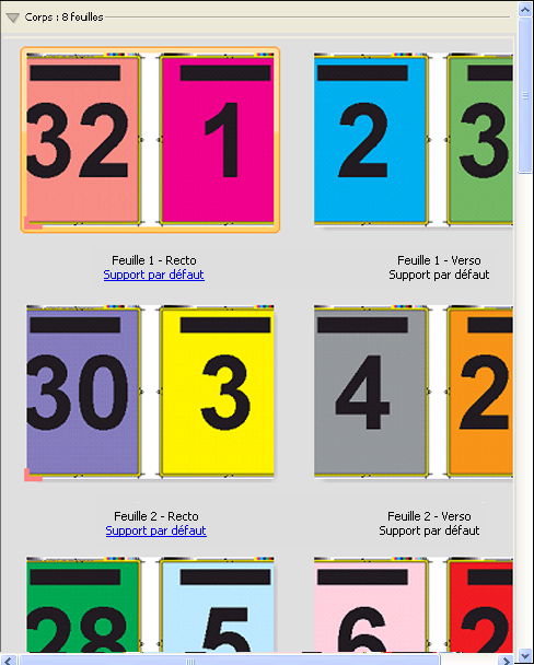 La mise en page Tête à tête 4 poses est destinée aux tâches composées de multiples de huit pages, mais elle peut également être utilisée avec d’autres tâches ayant un nombre de pages quelconque. Fiery Impose ajoute des pages vierges supplémentaires selon les besoins. Les pages sont agencées de manière à être consécutives lorsque les feuilles sont pliées selon deux plis à 90 degrés, massicotées, piquées et regroupées en cahiers.