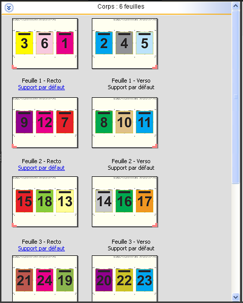 La mise en page Brochure 3 volets 3 poses est destinée aux tâches composées de six pages ou de multiples de six pages, mais elle peut également être utilisée avec d’autres tâches ayant un nombre de pages quelconque. Fiery Impose ajoute des pages vierges supplémentaires selon les besoins.