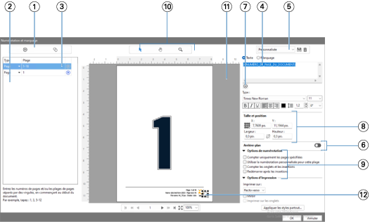| 12 | Champ d’affichage du numéro de page. Il peut être redimensionné et déplacé. |