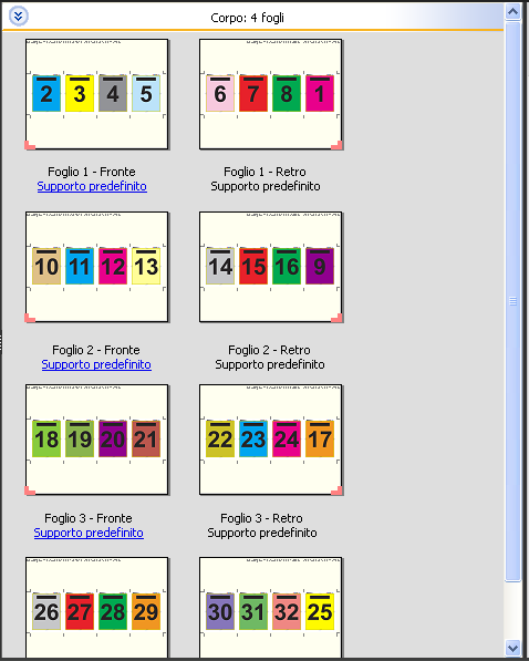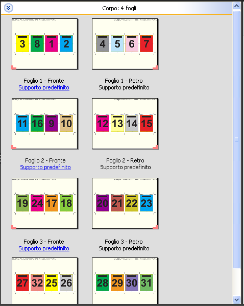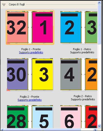 Il layout 4 pagine-testa contro testa è adatto per i lavori che hanno un numero di pagine multiplo di otto, ma può essere usato anche con lavori composti da qualsiasi numero di pagine. Se necessario, Fiery Impose aggiunge altre pagine vuote. Le pagine vengono ordinate in modo che, dopo che i fogli saranno stati piegati e cuciti insieme in segnature, le pagine risultino in sequenza.