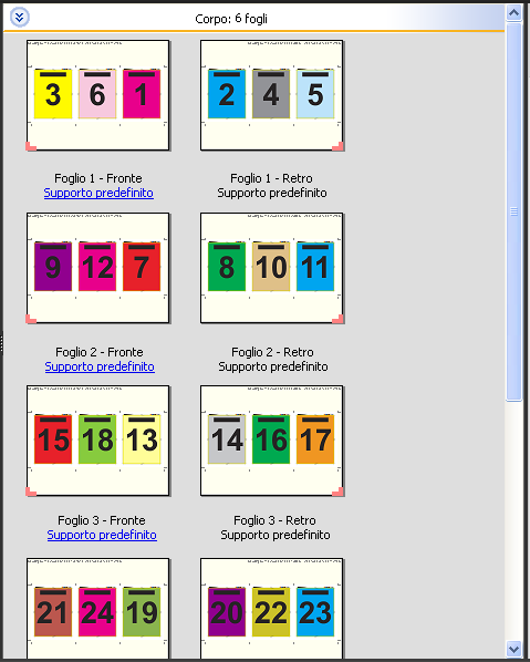 Il layout 3 pagine-piegatura a pannello è adatto per i lavori che hanno un numero di pagine multiplo di sei, ma può essere usato anche con lavori composti da qualsiasi numero di pagine. Se necessario, Fiery Impose aggiunge altre pagine vuote.