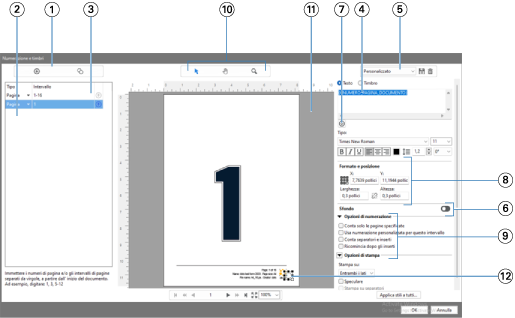 | 12 | Campo per la visualizzazione della numerazione delle pagine può essere ridimensionato e spostato. |