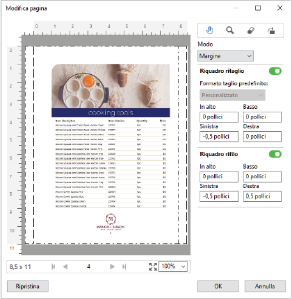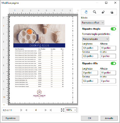 Modifica pagina può essere usato per ritagliare o spostare le pagine regolando il formato della pagina in base a Riquadro ritaglio o Riquadro rifilo.