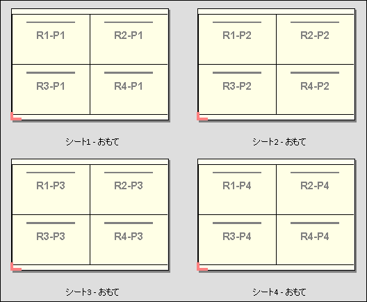 次のプレビューに、4つのレコードを含むVDPジョブに適用された、2x2の片面印刷の複数レコード丁合いレイアウトを示します。レコードはそれぞれページが4枚あります。Rはレコードを表し、Pはページを表しています。たとえば、R1 P1はレコード1の1ページ目です。