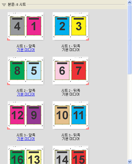 4업 머리 맞춤 레이아웃은 페이지 수가 8의 배수인 작업용이지만 페이지 수에 관계없이 어떤 작업에나 사용 가능합니다. Fiery Impose는 필요한 곳에 빈 용지를 추가합니다. 페이지는 시트를 90도에서 두 번 접어 인쇄지로 함께 중철하면 페이지가 순차적으로 포함되도록 순서가 지정됩니다.