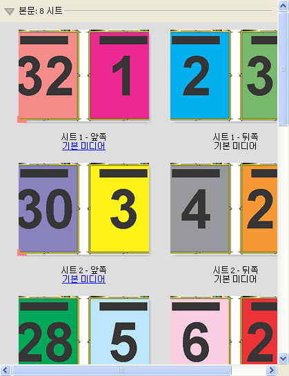 2업 중철 레이아웃을 사용하여 중철 제본 책자용 시트를 생성합니다. 모든 시트는 시트 안에 다른 시트가 들어가는 방식으로 함께 접힙니다. 이 레이아웃에 적용되는 설정은 다음과 같습니다.