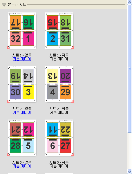 4업 머리 맞춤 레이아웃은 인쇄된 시트의 각 면에 있는 4개 페이지 레이아웃에서 생성하는 소책자용입니다. 맨 위의 2개 페이지를 회전하면 인쇄지를 가로와 세로로 모두 접어 트리밍할 수 있습니다. 완성된 소책자에는 올바른 순서와 회전이 적용된 모든 페이지가 포함됩니다.