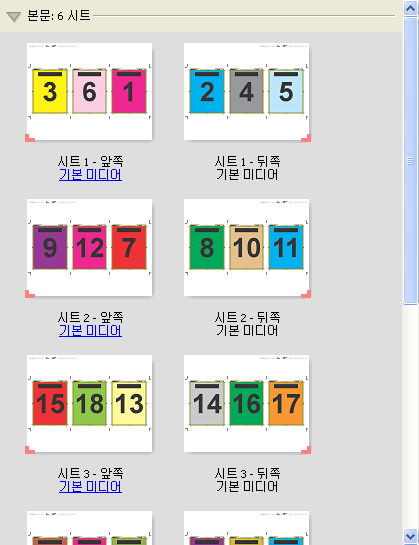3업 3단 접지 브로슈어 레이아웃은 페이지 수가 6이거나 6의 배수인 작업용이지만 페이지 수에 관계없이 어떤 작업에나 사용 가능합니다. Fiery Impose는 필요한 곳에 빈 용지를 추가합니다.