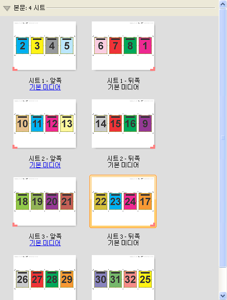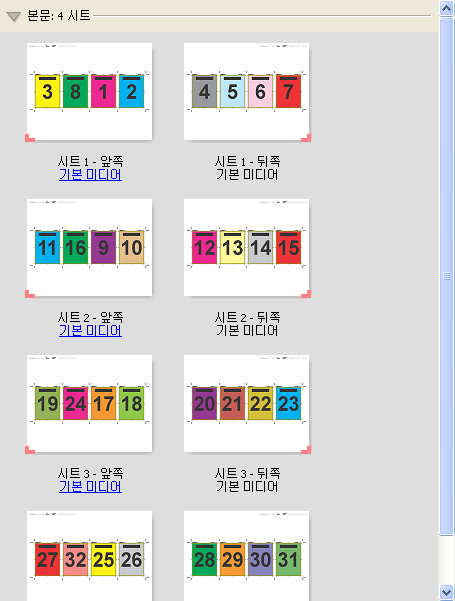 4업 접기 레이아웃은 페이지 수가 8의 배수인 작업용이지만 페이지 수에 관계없이 어떤 작업에나 사용 가능합니다. Fiery Impose는 필요한 곳에 빈 용지를 추가합니다.