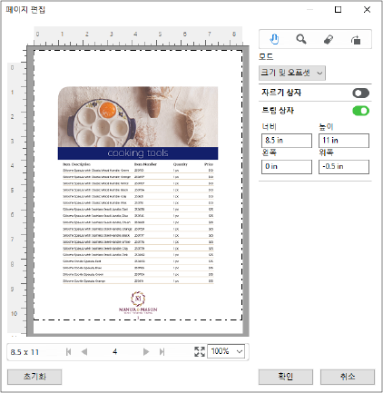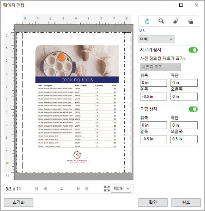 페이지 편집 기능을 사용하면 선택한 페이지의 내용을 이동하여 스테이플링 또는 구멍 펀치 유형의 마감이 적용될 때 페이지 내용 잘림을 방지할 수 있습니다.