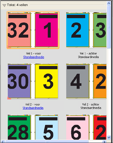 De opmaak 2 per vel, op de rug gebonden is bestemd voor taken met veelvouden van vier pagina's, maar u kunt deze opmaak ook gebruiken bij taken met een ander aantal pagina's. In Fiery Impose worden indien nodig blanco pagina's toegevoegd. Pagina's worden geordend in groepen van vier, zodat elk vel na het vouwen vier opeenvolgende pagina's bevat.