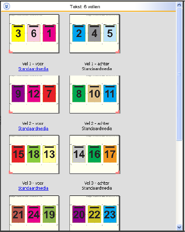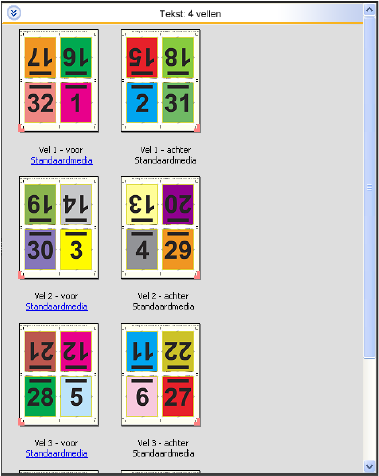 De opmaak 4 per vel, rug aan rug is bedoeld voor taken met veelvouden van acht pagina's, maar u kunt deze opmaak ook gebruiken voor taken met een ander aantal pagina's. In Fiery Impose worden indien nodig blanco pagina's toegevoegd. Pagina's worden zo gesorteerd dat ze op volgorde liggen als de vellen worden gevouwen met twee vouwen in een hoek van 90 graden en vervolgens worden bijgesneden en gebonden.