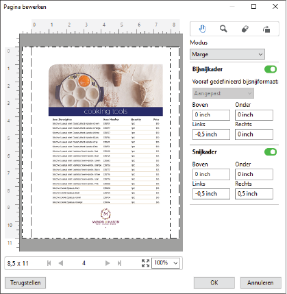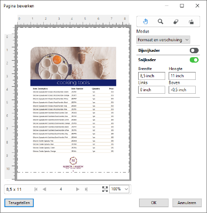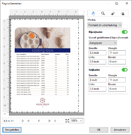 Pagina bewerken kan worden gebruikt om inhoud op een of meer pagina's bij te snijden of te verplaatsen door het formaat bij Bijsnijkader of Snijkader voor de pagina aan te passen.
