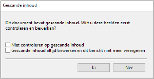 Als ingevoegde PDF-documenten gescande inhoud bevatten en de voorkeursinstelling voor het controleren van gescande inhoud is ingeschakeld, wordt u in een bericht gevraagd of u de gescande afbeeldingen wilt bekijken en bewerken. Alleen pagina's met gescande afbeeldingen worden voor bewerking voor u weergegeven. Zowel het controleren op gescande inhoud als het weergeven van het bericht voor gescande inhoud is een voorkeursinstelling die u kunt uitschakelen.