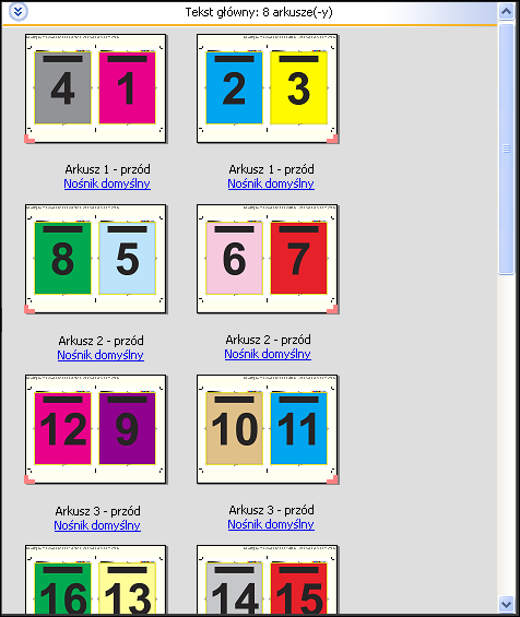 Układ Składanie typu „Z” 4-up jest przeznaczony do zadań składających się z ośmiu stron, jednak można używać go również w przypadku zadań o dowolnej liczbie stron. Aplikacja Fiery Impose w razie potrzeby dodaje dodatkowe puste strony.
