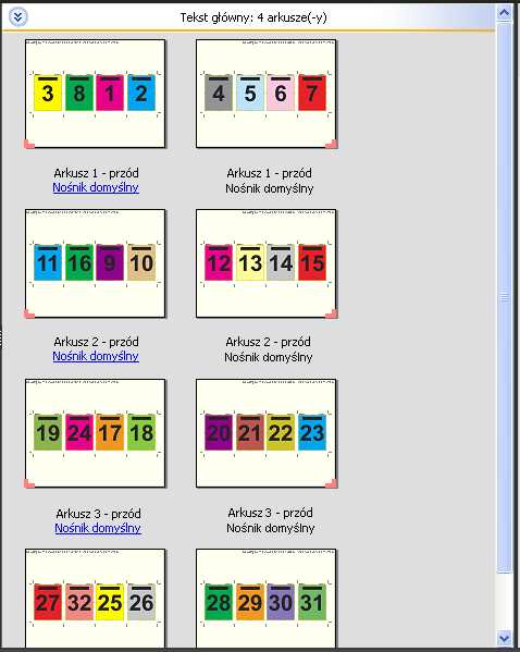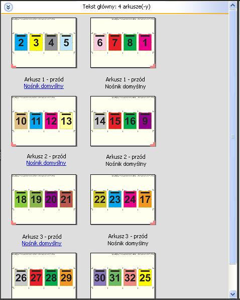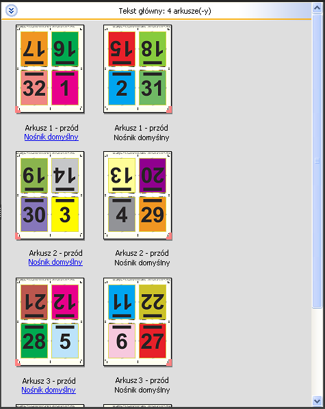 Układ Zeszytowy 2-up jest przeznaczony do zadań składających się z wielokrotności czterech stron, jednak można używać go również w przypadku zadań o dowolnej liczbie stron. Rozwiązanie Fiery Impose w razie potrzeby dodaje dodatkowe puste strony. Strony składane są w celu uzyskania prawidłowej ich kolejności po złożeniu i zszyciu arkuszy.