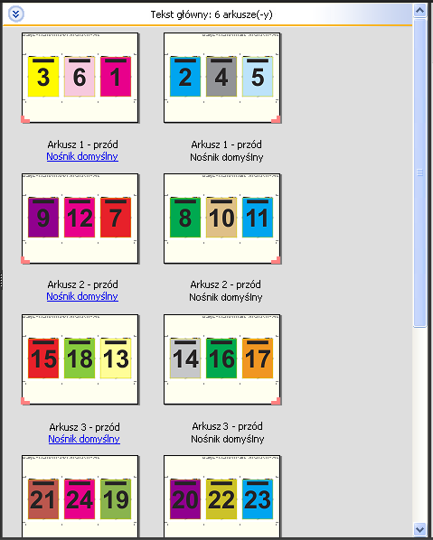 Układ Broszura składana na 3 typu 3-up jest przeznaczony do zadań składających się z sześciu stron lub wielokrotności sześciu stron, jednak można używać go również w przypadku zadań o dowolnej liczbie stron. Rozwiązanie Fiery Impose w razie potrzeby dodaje dodatkowe puste strony.