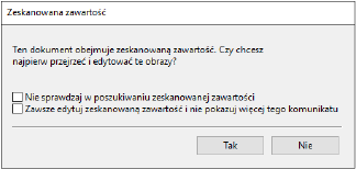 Jeżeli wstawione dokumenty PDF zawierają zeskanowaną zawartość, a funkcja jej sprawdzania jest włączona, oprogramowanie zapyta o chęć sprawdzenia i wykonania edycji zeskanowanych obrazów. Wyświetlone zostaną wyłącznie strony zawierające zeskanowane obrazy. Z drugiej strony, funkcje sprawdzania dokumentu pod kątem zeskanowanej zawartości i wyświetlania stosownego komunikatu przez oprogramowanie można wyłączyć.