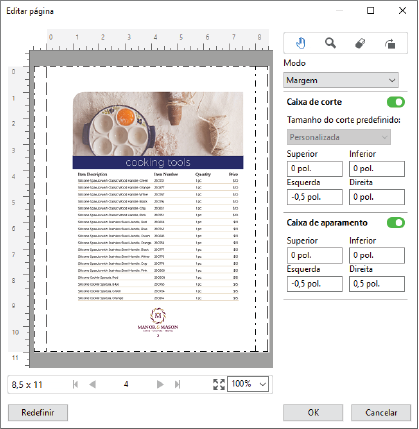 O Editar página pode ser usado para cortar ou mover o conteúdo em uma página ou páginas ajustando o tamanho da Caixa de corte ou Caixa de aparamento.