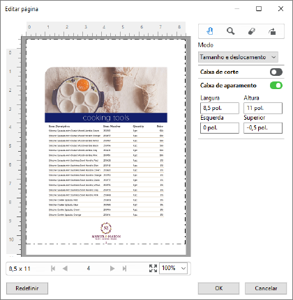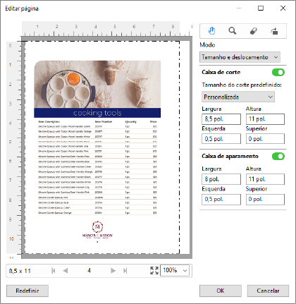 Quando a Caixa de corte tiver sido ativada, a opção Tamanho e deslocamento permite personalizar a Caixa de corte selecionando um tamanho da folha padrão ou especificando a Largura e a Altura da Caixa de corte. As opções Esquerda e Parte superior são usadas para especificar a distância entre o lado esquerdo e a parte superior da Caixa de aparamento em relação à Caixa de corte. Quando a Caixa de aparamento tiver sido ativada, a Caixa de aparamento da página pode ser personalizada especificando a Largura e a Altura.