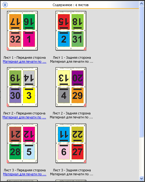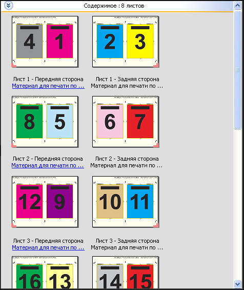 Компоновка 4 на страницу, верх к верху предназначена для заданий, количество страниц в которых кратно восьми, однако ее можно использовать для заданий с любым количеством страниц. При необходимости Fiery Impose добавляет дополнительные пустые страницы. Страницы упорядочиваются таким образом, чтобы после фальцовки листов с использованием двух сгибов под углом 90 градусов, обрезки листов и склеивания в тетради страницы располагались последовательно.