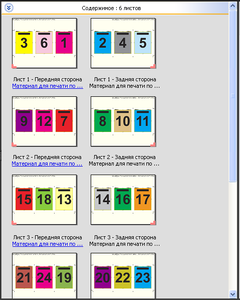 Компоновка 3 на страницу, сложенная втрое брошюра предназначена для заданий, количество страниц в которых равно или кратно шести, однако ее можно использовать для заданий с любым количеством страниц. При необходимости Fiery Impose добавляет дополнительные пустые страницы.