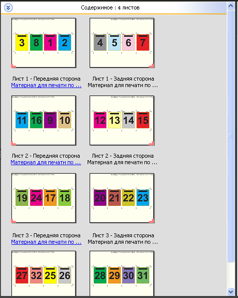 Компоновка 2-полосный клеевой переплет предназначена для заданий, количество страниц в которых кратно четырем, однако ее можно использовать для заданий с любым количеством страниц. При необходимости Fiery Impose добавляет дополнительные пустые страницы. Страницы упорядочиваются в группы по четыре страницы таким образом, чтобы после фальцовки на каждом листе располагалось четыре последовательные страницы.