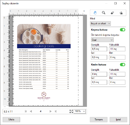 Kırpma kutusu ve/veya Kesim kutusu ayarlarını yapmak için Kenar boşluğu veya Boyut ve ofset'i seçin.