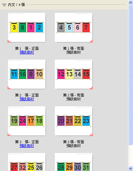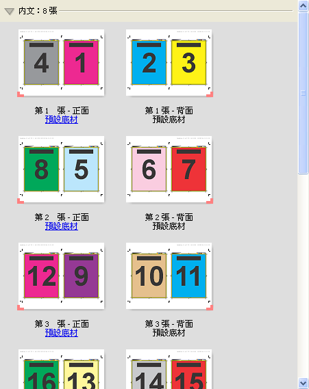 雙頁膠裝版面配置適用於頁面數為四倍數的工作,但是也可以與任何頁面數的工作一起使用。Fiery Impose 會在必要時新增額外的空白頁。頁面以一組四張的形式依序排列,因此,摺疊時,每張紙都會有四個連續的頁面。