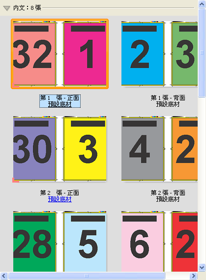 雙頁鞍式版面配置會建立適用於鞍式裝訂書本的紙張。所有的紙張一起進行摺疊,後一張紙會放在前一張紙的內側。下列設定適用於這個版面配置:
