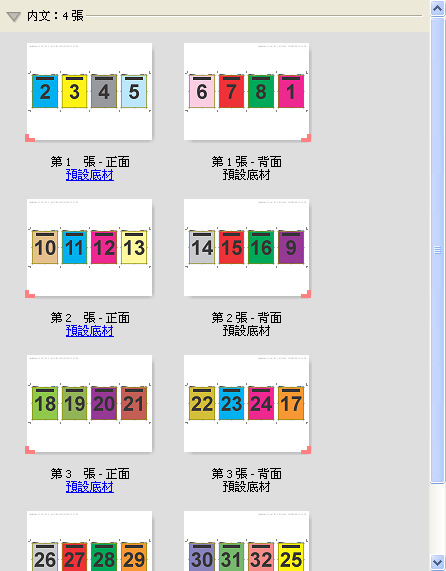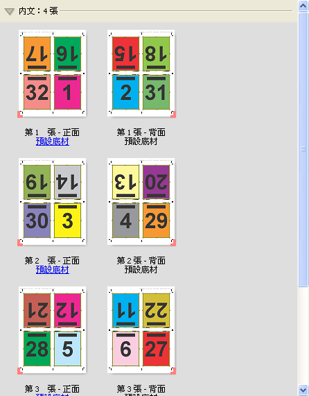 四頁頁首對頁首版面配置適用於手冊,這類手冊採用在已列印紙張的每一面上有四個頁面的版面配置方法建立而成。旋轉最上方兩個頁面,可讓您同時水平和垂直地摺疊書帖,然後剪裁。完成的手冊內所有的頁面會以正確的順序和方向排列。