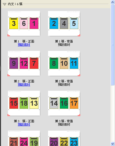 三頁三摺宣傳手冊版面配置適用於頁面數為六或六倍數的工作,但是也可以與任何頁面數的工作一起使用。Fiery Impose 會在必要時新增額外的空白頁。