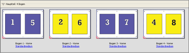 Das bei der Sammelform Einmal verwendete Verfahren eignet sich besonders für Fälle, in denen nur eine Kopie eines Auftragsdokuments benötigt wird. Bei dieser Option werden die Seiten nicht richtig konfektioniert, d. h. sie müssen manuell sortiert werden. Die Sammelform nutzt aber die Bogenfläche in optimaler Weise und begrenzt gleichzeitig die Auflage auf eine Kopie.