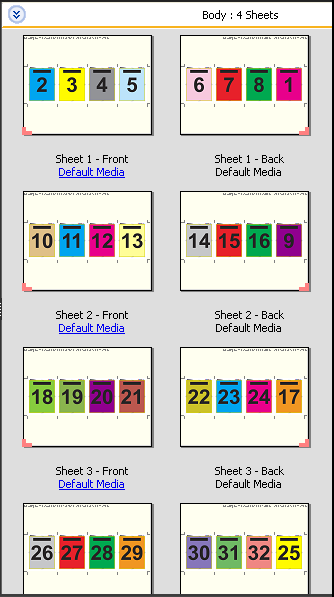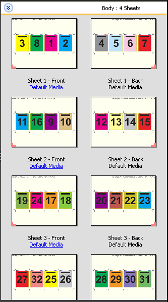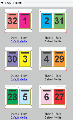 The 4-up head to head layout is for jobs that have multiples of eight pages, but you can use it for jobs that have any number of pages. Fiery Impose Plus adds additional blank pages as necessary. Pages are ordered so that, when sheets are folded with two folds at 90 degrees, trimmed, and stitched together into signatures, the pages are sequential.