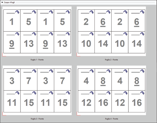 Con l'opzione Elementi unici, le pagine vengono disposte secondo un ordine che è spesso più appropriato per la stampa di una singola copia di un lavoro. Questa opzione non consente di eseguire una fascicolazione completa (è necessario ricorrere alla fascicolazione manuale), ma consente di ottimizzare il formato del foglio limitando la tiratura a una copia singola.