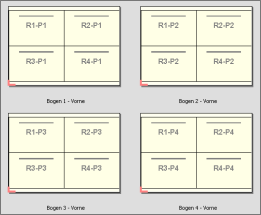 In der folgenden Vorschau wird eine Sammelform vom Typ Mehrsatzmodus – Sortieren mit 2 Zeilen und 2 Spalten auf einen VDP-Auftrag angewendet, in dem vier Datensätze enthalten sind. Jeder dieser Datensätze umfasst vier Seiten. In der Abbildung steht „R“ für Datensatz (engl. „Record“) und „P“ für Seite (engl. „Page“). So bedeutet „R1 P1“ zum Beispiel „Seite 1 aus Datensatz 1“.