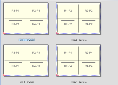 En la siguiente presentación preliminar se muestra un diseño de 2 por 2, a una sola cara, con un diseño Ordenar con varios registros aplicado a un trabajo de impresión de datos variables (VDP) que contiene cuatro registros. Los registros están formados por cuatro páginas cada uno. “R” indica Registro y “P” Página. Por ejemplo, “R1 P1” es Página 1 para Registro 1.