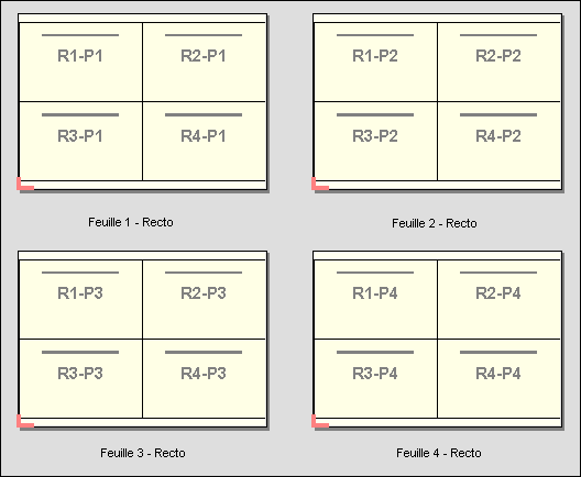 L’aperçu suivant présente des agencements recto 2 à 2 et en mode Assemblage de plusieurs enregistrements, appliqués à une tâche VDP qui contient quatre enregistrements. Chacun des enregistrements se compose de quatre pages. « R » correspond à Enregistrement (Record), et « P » à Page. Par exemple, « R1 P1 » correspond à la page 1 de l’enregistrement 1.