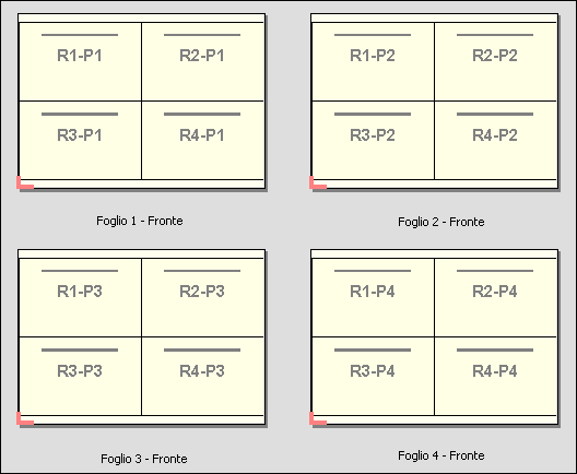 L'anteprima sotto riportata mostra il layout di Raccogli record multipli per la stampa su lato singolo 2x2 applicato a un lavoro VDP contenente quattro record. Ciascun record è composto da quattro pagine. “R” sta per record, mentre “P” indica la pagina. Ad esempio, “R1 P1” indica la pagina 1 per il record 1.