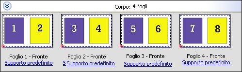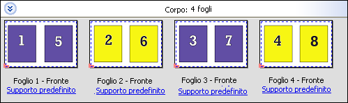 Con l'opzione Elementi unici, le pagine vengono disposte secondo un ordine che è spesso più appropriato per la stampa di una singola copia di un lavoro. Questa opzione non consente di eseguire una fascicolazione completa (è necessario ricorrere alla fascicolazione manuale), ma consente di ottimizzare il formato del foglio limitando la tiratura a una copia singola.