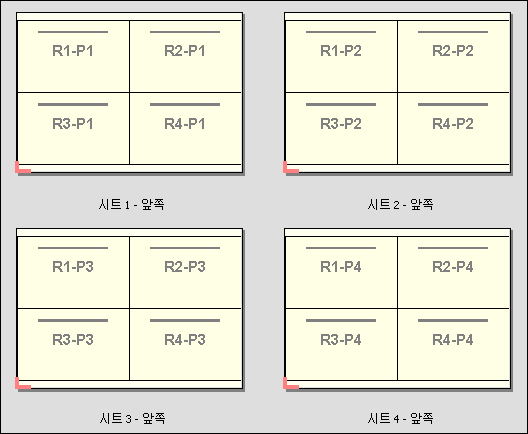 다중 레코드 모음을 사용하는 경우 여러 레코드의 페이지를 시트 표면에 순차적으로 배치합니다. 모든 레코드가 소진될 때까지 각 레코드의 첫 페이지를 시트 표면에 배치합니다. 그런 후에는 새 시트가 시작되어 모든 레코드가 소진될 때까지 각 레코드의 두 번째 페이지를 배치합니다. 모든 페이지를 배치할 때까지 이 프로세스를 반복합니다.