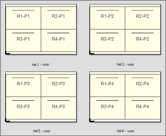 In het volgende voorbeeld wordt een opmaak Meerdere records collationeren (2x2, enkelzijdig) weergegeven die op een VDP-taak met vier records is toegepast. Elke record bestaat uit vier pagina's. R staat voor record, P voor pagina. R1 P1 is bijvoorbeeld pagina 1 van record 1.