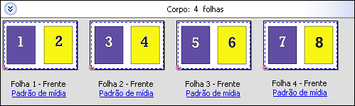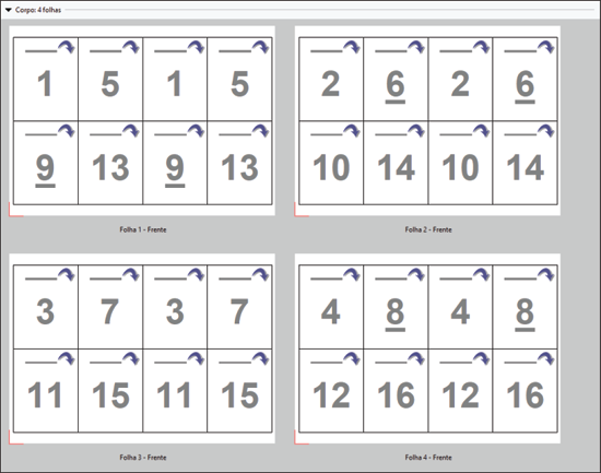 O Corte intercalado único posiciona as páginas de forma que caiam na ordem correta quando as folhas forem empilhadas e cortadas. Essa opção reduz a necessidade de intercalar manualmente e é mais apropriada para a impressão de cópias únicas de um documento.