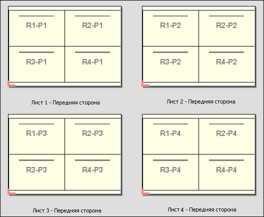 На следующем рисунке показан результат применения макета односторонней печати 2 х 2 с настройкой Разбор по копиям из нескольких записей к заданию VDP, содержащему четыре записи. Каждая запись состоит из четырех страниц. R означает запись, а P означает страницу. Например, R1 P1 означает первую страницу первой записи.