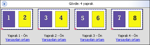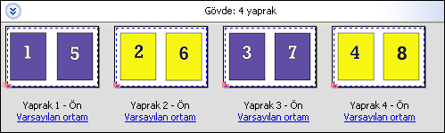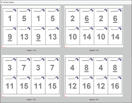 Birleşik yükleme düzeni için Duplo - uzun kenarlı besleme seçeneği belirlendiğinde, son yazdırılan yaprağın uzun kenarından bir Duplo sonlandırıcıya beslendiği bir sayfalandırma yönü ayarlanır. Sütunlar veya satırlar, en uzun yaprak kenarına dik bir yönde düzenlenir.