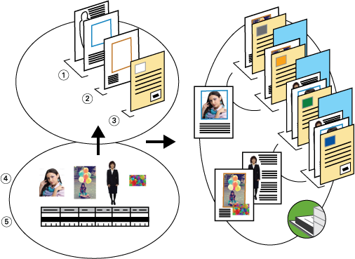 As an example, print a personalized mailer. The workflow uses a database consisting of images of different types of people, devices that they typically use, and background graphics.